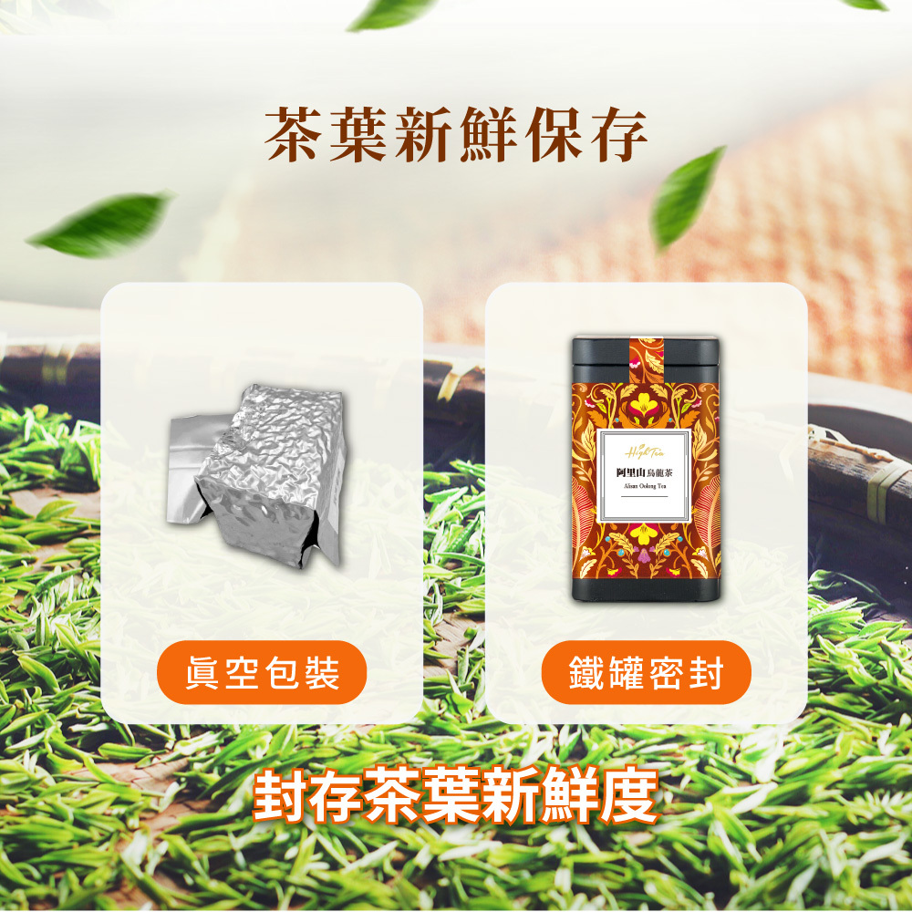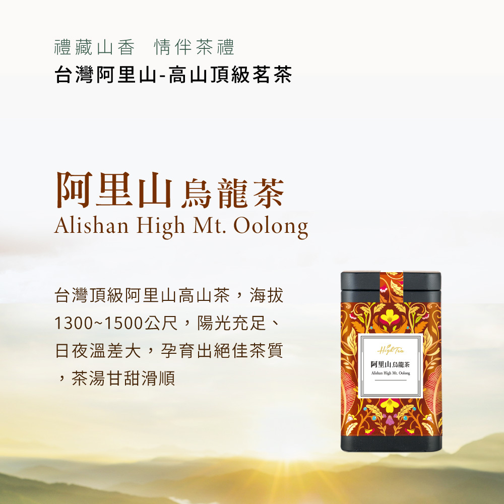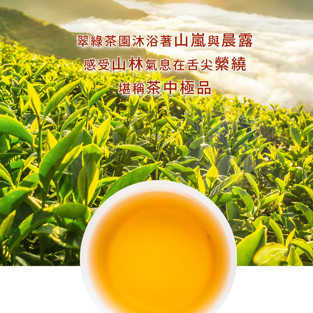 台灣頂級阿里山高山茶,海拔1300~1500公尺,陽光充足、日夜溫差大,孕育出絕佳茶質,茶湯甘甜滑順,翠綠茶園沐浴著山嵐與晨露,更能感受到山林氣息在舌尖縈繞,堪稱茶中極品。
