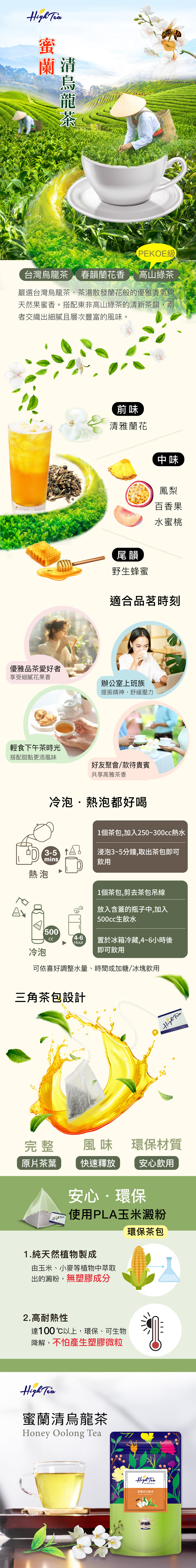 東非海拔1500公尺PEKOE級高山綠茶與台灣烏龍茶,匠心絕妙的融合,茶湯如琥珀般金黃明亮,如晨曦般溫暖透澈。入口時清雅的蘭花香撲鼻而來,中段果香馥郁帶有鳳梨、百香果與水蜜桃的甜美韻味,尾韻野生蜂蜜般的細膩回甘。
