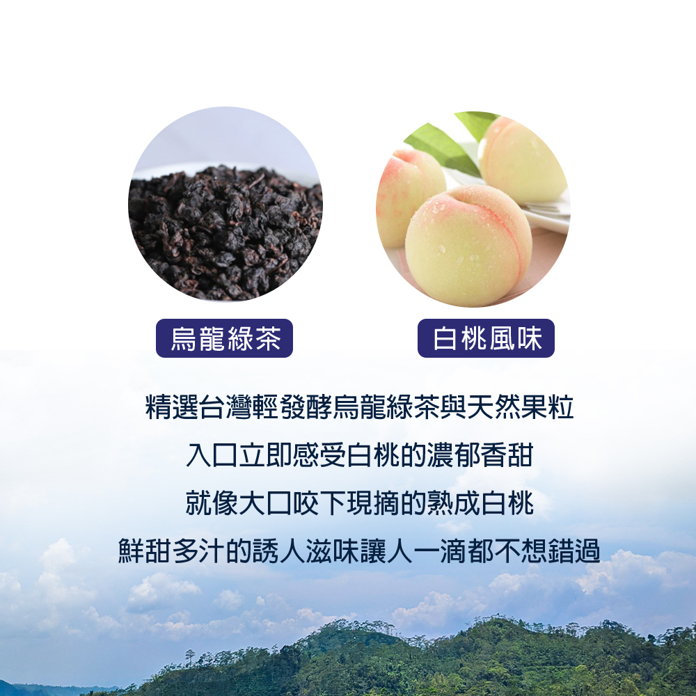 ◎選用台灣輕發酵烏龍綠茶搭配天然果粒,入口即可感受濃郁白桃香