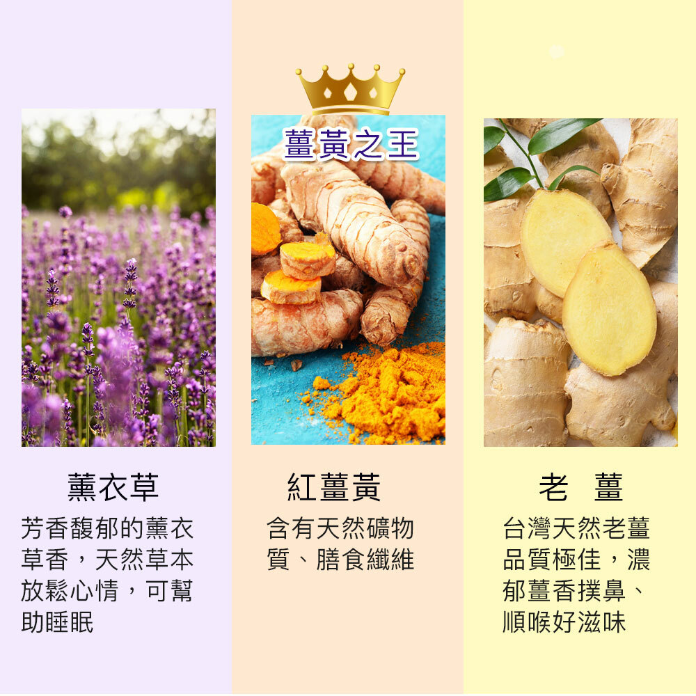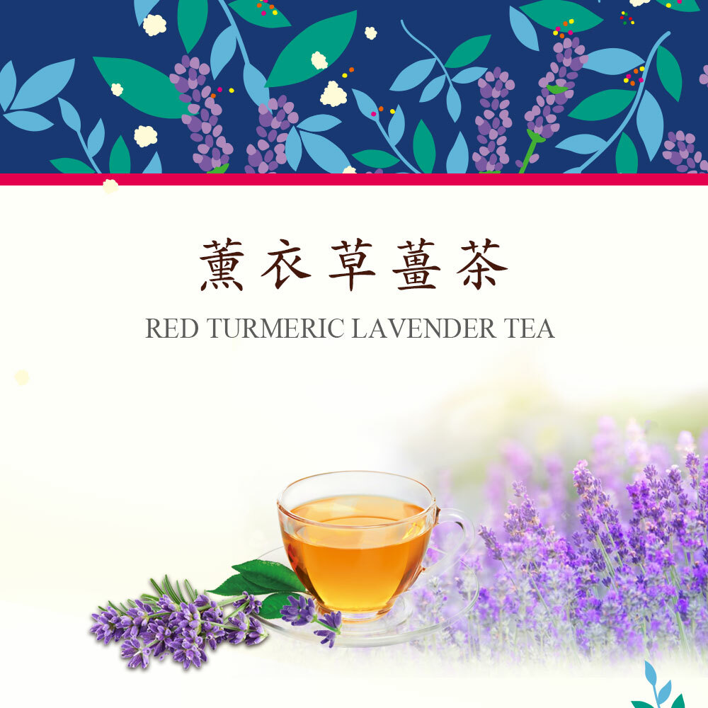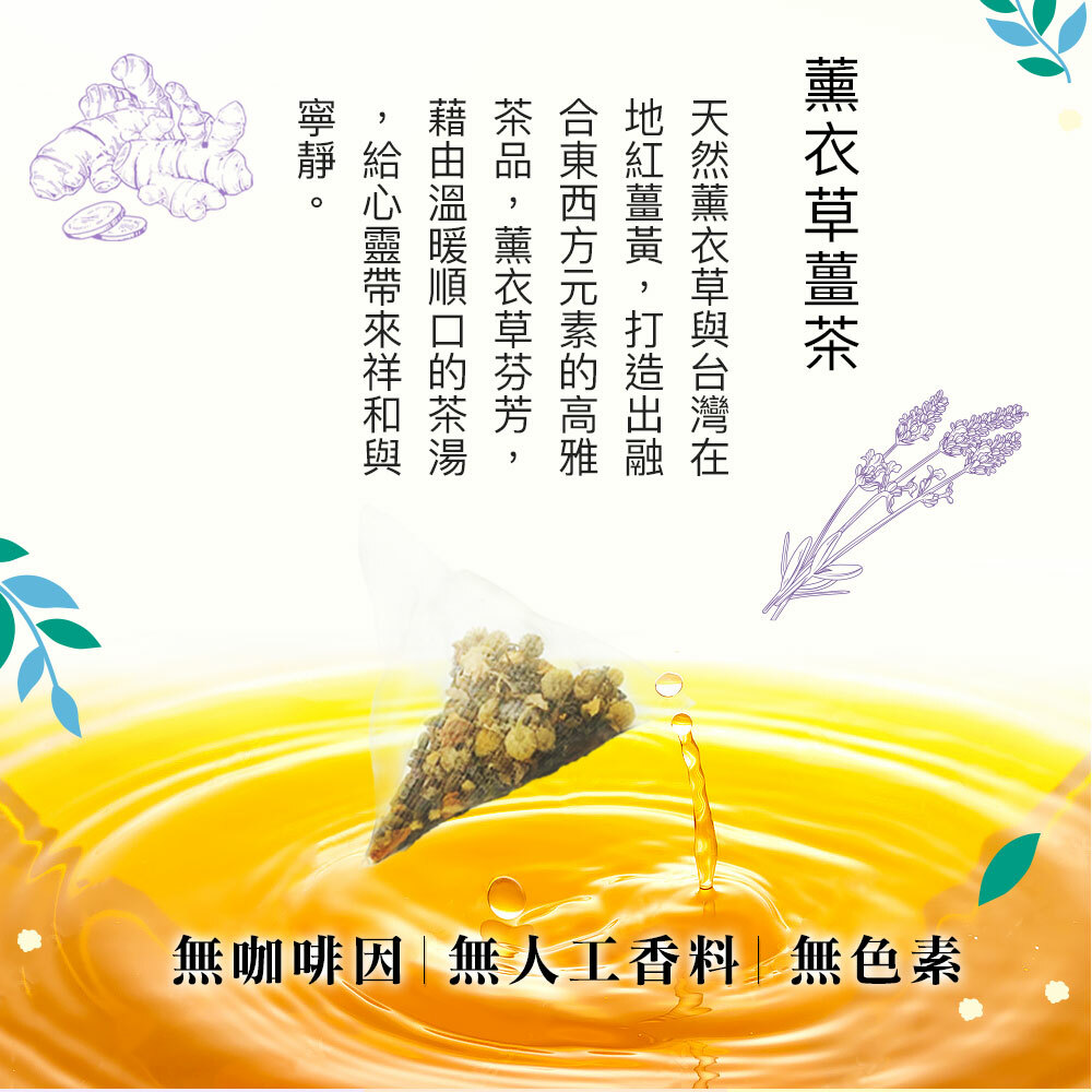 嚴選台灣在地紅薑黃與老薑,搭配天然薰衣草,融合東西方元素的高雅茶品。